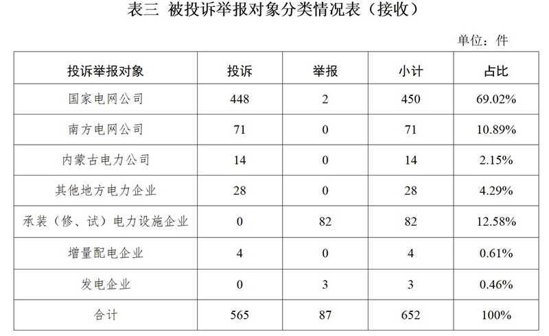 供電企業(yè)567件、占投訴舉報總數(shù)的86.96%,其中:國家電網(wǎng)公司450件、占投訴舉報總數(shù)的69.02%,南方電網(wǎng)公司71件、占投訴舉報總數(shù)的10.89%,內(nèi)蒙古電力公司14件、占投訴舉報總數(shù)的2.15%,其他地方電力企業(yè)28件、占投訴舉報總數(shù)的4.29%,增量配電企業(yè)4件,占投訴舉報總數(shù)的0.61%;承裝(修、試)電力設施企業(yè)82件、占投訴舉報總數(shù)的12.58%;發(fā)電企業(yè)3件、占投訴舉報總數(shù)的0.46%。