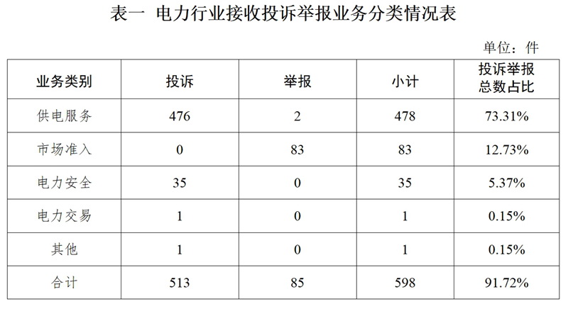 電力行業(yè)排在首位,數(shù)量為598件、占投訴舉報總數(shù)的91.72%,主要集中在供電服務、市場準入、電力安全等方面。