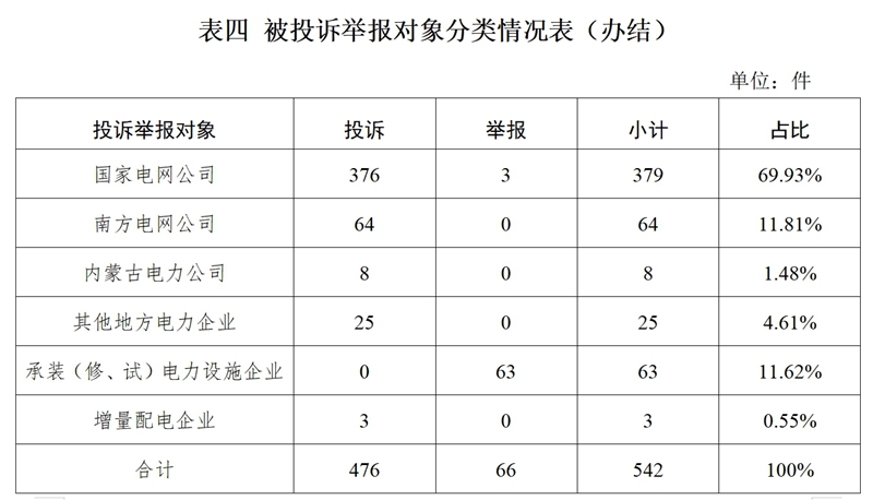 從被投訴舉報對象看,供電企業(yè)478件、占投訴舉報總數(shù)的88.37%,其中:國家電網(wǎng)公司379件、占比69.93%;南方電網(wǎng)公司64件、占比11.81%;內(nèi)蒙古電力公司8件、占比1.48%;其他地方電力企業(yè)25件、占比4.61%;承裝(修、試)電力設施企業(yè)63件、占比11.62%;增量配電企業(yè)3件、占比0.55%。