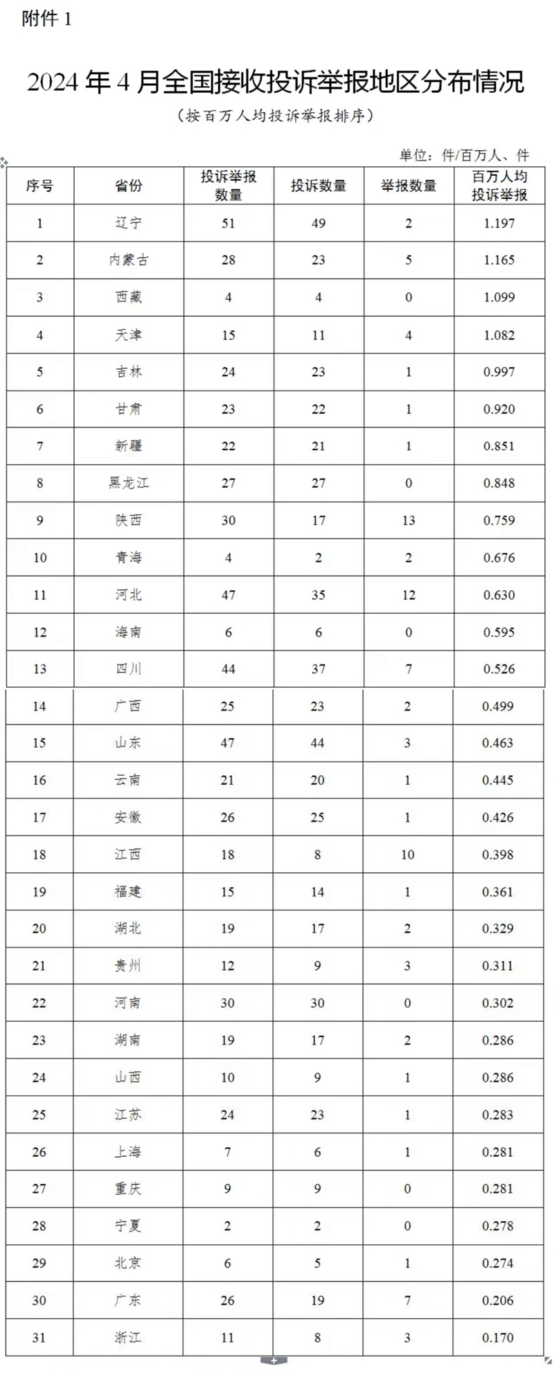 各省(自治區(qū)、直轄市)按照接收投訴舉報數(shù)量排序,遼寧、河北、山東、四川、河南(與陜西并列)排在全國前5位。按百萬人均投訴舉報數(shù)量排序,遼寧、內(nèi)蒙古、西藏、天津、吉林排在全國前5位。(2024年4月全國接收投訴舉報地區(qū)分布情況,見附件1)