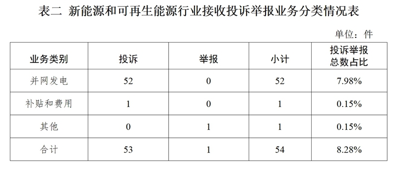 新能源和可再生能源行業(yè)排在第二位,數(shù)量為54件、占投訴舉報總數(shù)的8.28%,主要集中在并網(wǎng)發(fā)電方面。