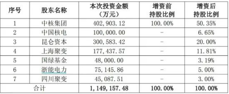 相關(guān)信息顯示中核集團(tuán)、中國(guó)核電、浙能電力、中國(guó)石油集團(tuán)昆侖資本有限公司、上海未來(lái)聚變能源科技有限公司、國(guó)家綠色發(fā)展基金股份有限公司及四川重科聚變能源科技有限公司,以1.0019元/注冊(cè)資本的價(jià)格,共同向中國(guó)聚變能源有限公司投資約114.92億元,認(rèn)購(gòu)聚變公司新增注冊(cè)資本114.69億元。其中,中核集團(tuán)本輪出資40.29億元,增資后持有中國(guó)聚變公司50.35%股份。中國(guó)核電投資金額為10億元,持有聚變公司6.65%股權(quán);浙能電力出資約7.51億元,持有聚變公司5%股權(quán)。此外,中石油旗下昆侖資本此次投資約30.06億元,獲得中國(guó)聚變公司20%股份,成為第二大股東,本次增資完成后,聚變公司的注冊(cè)資本為150億元,具體股權(quán)結(jié)構(gòu)如下: