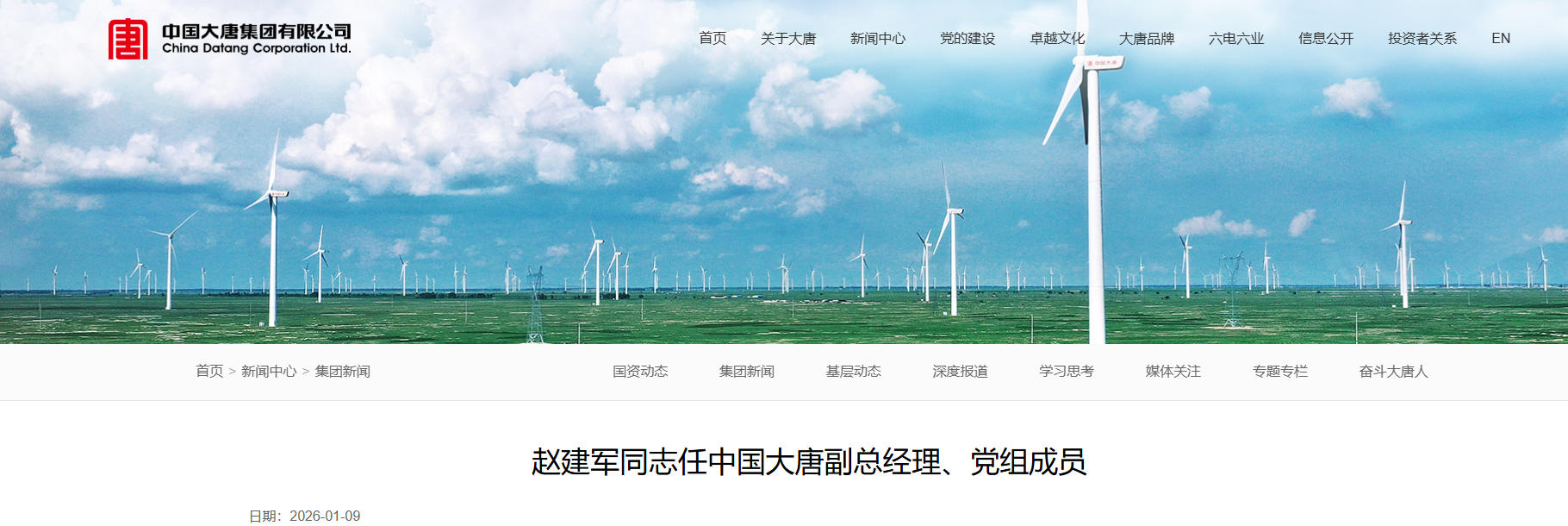 1月9日上午,中國大唐集團(tuán)有限公司召開領(lǐng)導(dǎo)班子擴(kuò)大會議,通報(bào)了中央關(guān)于趙建軍同志任中國大唐集團(tuán)有限公司副總經(jīng)理、黨組成員的決定。上述任職按有關(guān)法律規(guī)定辦理。