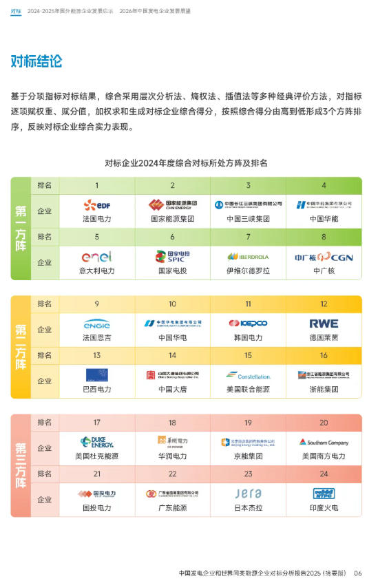 誰在領(lǐng)跑?2024年全球發(fā)電企業(yè)競(jìng)爭(zhēng)格局呈現(xiàn)“穩(wěn)中有變、動(dòng)態(tài)調(diào)整”的特點(diǎn)。從綜合排名看,法國電力、國家能源集團(tuán)、中國三峽集團(tuán)、中國華能、意大利電力、國家電投、伊維爾德羅拉、中廣核8家企業(yè)處于第一方陣。綜合排名最明顯的變化,為法國電力與國家能源集團(tuán)的“首位輪換”,從去年的第二位躍居榜首。法國電力全年?duì)I業(yè)收入1243億美元,同比下降15.0%,營收明顯下降未對(duì)公司盈利能力產(chǎn)生實(shí)質(zhì)性影響。國家能源集團(tuán)綜合排名第二,相較2023年下降一個(gè)名次。截至2024年底,國家能源集團(tuán)發(fā)電裝機(jī)容量達(dá)到3.55億千瓦,繼續(xù)保持全部對(duì)標(biāo)企業(yè)中企業(yè)頭名地位。受國內(nèi)煤炭價(jià)格下行影響,國家能源集團(tuán)營業(yè)收入同比下降2.3%。2024年,中國華能綜合排名第四,同比上升一個(gè)名次。中國華能專利實(shí)力排名位居國內(nèi)對(duì)標(biāo)企業(yè)首位,發(fā)電裝機(jī)容量、發(fā)電量排名與2023年持平,位居第二位。美國聯(lián)合能源2024年對(duì)標(biāo)綜合排名從第23位躍升至第15位,上升8名。美國聯(lián)合能源凈資產(chǎn)收益率更是高達(dá)30.1%,位列第一,比2023年提高16個(gè)百分點(diǎn)。排名變化背后,既是企業(yè)戰(zhàn)略與市場(chǎng)環(huán)境的直接反映,也預(yù)示著能源企業(yè)從規(guī)模擴(kuò)張向質(zhì)量效益轉(zhuǎn)型的必然趨勢(shì)。
