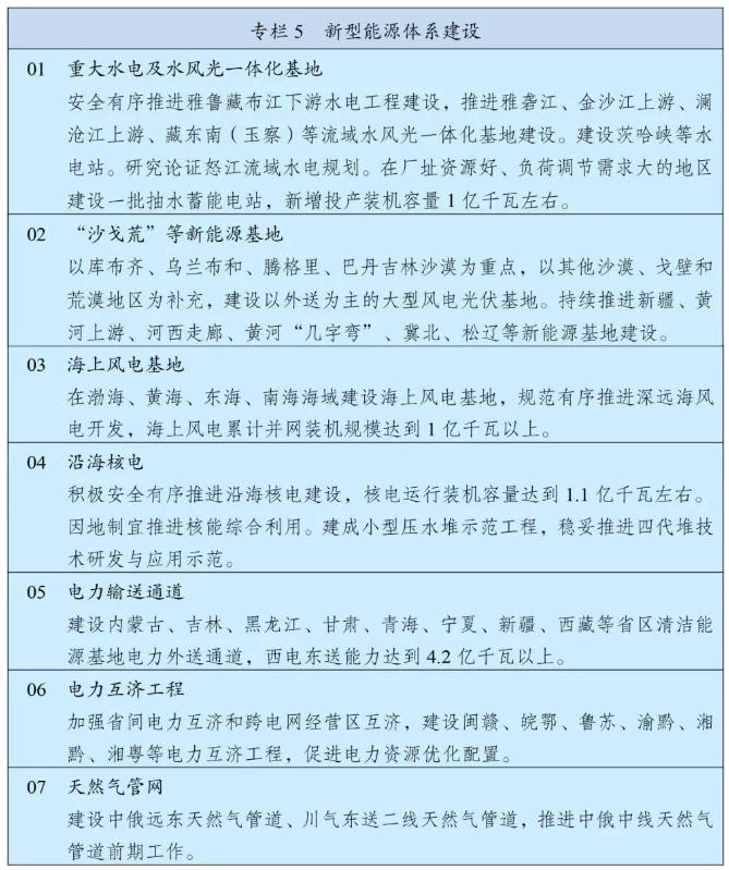 同時(shí),《綱要》提出要加力建設(shè)新型能源基礎(chǔ)設(shè)施,深入實(shí)施能源安全新戰(zhàn)略,加快構(gòu)建清潔低碳安全高效的新型能源體系,建設(shè)能源強(qiáng)國。推進(jìn)非化石能源安全可靠有序替代化石能源,堅(jiān)持風(fēng)光水核等多能并舉,實(shí)施非化石能源十年倍增行動(dòng)。統(tǒng)籌就地消納和外送,建設(shè)“三北”風(fēng)電光伏、西南水風(fēng)光一體化、沿海核電、海上風(fēng)電等清潔能源基地,加強(qiáng)分布式能源就近開發(fā)利用,布局發(fā)展綠色氫氨醇,積極推進(jìn)光熱發(fā)電和地?zé)崮芾?。加?qiáng)化石能源清潔高效利用,推進(jìn)煤電改造升級(jí)和散煤替代。著力構(gòu)建新型電力系統(tǒng),全面提升電力系統(tǒng)互補(bǔ)互濟(jì)和安全韌性水平,優(yōu)化全國電力流向和跨區(qū)域通道布局,加快智能電網(wǎng)建設(shè),完善城鄉(xiāng)配電網(wǎng),科學(xué)布局抽水蓄能,大力發(fā)展新型儲(chǔ)能。提高終端用能電氣化水平,推動(dòng)能源消費(fèi)綠色化低碳化?;窘ǔ扇珖y(tǒng)一電力市場體系,完善油氣“全國一張網(wǎng)”運(yùn)行調(diào)度機(jī)制。