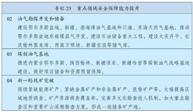 《綱要》提出,要強(qiáng)化能源資源供應(yīng)保障,要堅(jiān)持立足國內(nèi)、補(bǔ)齊短板、多元保障、強(qiáng)化儲(chǔ)備,加強(qiáng)能源產(chǎn)供儲(chǔ)銷體系建設(shè)。堅(jiān)持油氣核心需求自主保障,實(shí)施中長期油氣增儲(chǔ)上產(chǎn)戰(zhàn)略行動(dòng),確保原油年產(chǎn)量穩(wěn)定在2億噸左右、天然氣產(chǎn)量穩(wěn)步增長,加強(qiáng)煤制油氣產(chǎn)能和技術(shù)儲(chǔ)備。強(qiáng)化政府儲(chǔ)備和企業(yè)儲(chǔ)備協(xié)同,提升國家石油儲(chǔ)備規(guī)模,建立更加靈活的輪換動(dòng)用機(jī)制,增強(qiáng)天然氣儲(chǔ)備調(diào)節(jié)保障能力,完善煤炭儲(chǔ)備體系。健全能源保供中長期合同制度,完善電力應(yīng)急調(diào)度機(jī)制和備用電源配置,強(qiáng)化能源需求側(cè)管理。加強(qiáng)戰(zhàn)略性礦產(chǎn)資源勘探開發(fā)和儲(chǔ)備,深入實(shí)施新一輪找礦突破戰(zhàn)略行動(dòng),統(tǒng)籌加強(qiáng)產(chǎn)品、產(chǎn)能和產(chǎn)地儲(chǔ)備,推動(dòng)大宗商品儲(chǔ)運(yùn)基地建設(shè),提升戰(zhàn)略性礦產(chǎn)資源安全風(fēng)險(xiǎn)監(jiān)測預(yù)警和應(yīng)急保供水平。加強(qiáng)能源資源開發(fā)國際合作,維護(hù)戰(zhàn)略通道安全。
