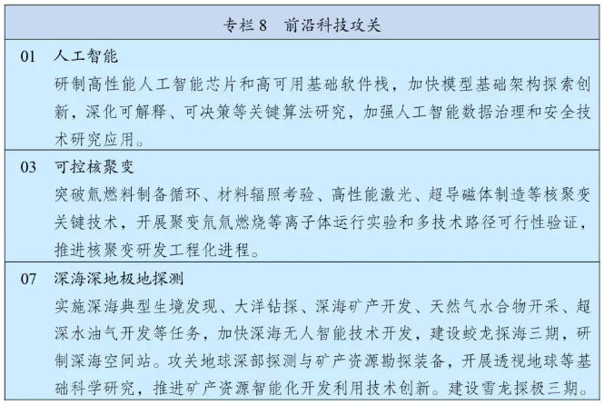 《綱要》提出,要強(qiáng)化戰(zhàn)略前沿領(lǐng)域科技布局,瞄準(zhǔn)世界科技前沿強(qiáng)化系統(tǒng)布局,實(shí)施人工智能、量子科技、生物科技、新能源等科技戰(zhàn)略部署,加快突破基礎(chǔ)理論和底層技術(shù),促進(jìn)轉(zhuǎn)化應(yīng)用。高水平組織前沿技術(shù)預(yù)測預(yù)見,建立國家關(guān)鍵和新興技術(shù)清單,持續(xù)推動(dòng)前沿技術(shù)研發(fā)。強(qiáng)化科學(xué)研究、技術(shù)開發(fā)原始創(chuàng)新導(dǎo)向,優(yōu)化有利于原創(chuàng)性顛覆性創(chuàng)新的環(huán)境,創(chuàng)新非共識(shí)項(xiàng)目遴選和資助機(jī)制,擴(kuò)大國家重大科技任務(wù)、國家自然科學(xué)基金原創(chuàng)性顛覆性項(xiàng)目規(guī)模和比例。突出國家戰(zhàn)略需求,扎實(shí)推進(jìn)國家科技重大專項(xiàng),超前部署面向2035的國家重大科技項(xiàng)目。