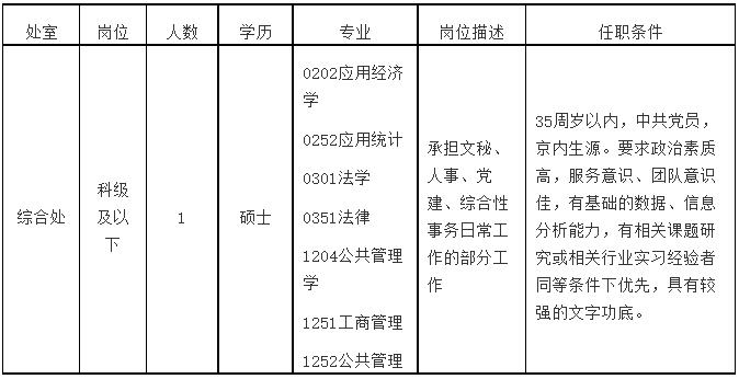 綜合處主任科員及以下崗位1人(京內(nèi)生源的碩士應(yīng)屆畢業(yè)生)。35周歲以內(nèi),中共黨員,要求政治素質(zhì)高,服務(wù)意識、團隊意識佳,有基礎(chǔ)的數(shù)據(jù)、信息分析能力,同等條件下有相關(guān)課題研究或相關(guān)行業(yè)實習經(jīng)驗者優(yōu)先,具有較強的文字功底。具體要求詳見下表。