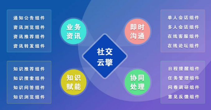 遠(yuǎn)光社交云擎套件,含即時(shí)溝通、知識(shí)賦能、業(yè)務(wù)資訊、協(xié)同處理四大云擎組件,所有組件能夠與企業(yè)各類業(yè)務(wù)系統(tǒng)深度融合,以人為核心,以高效協(xié)同為根本,改變企業(yè)及組織傳統(tǒng)的互動(dòng)與信息共享方式,破解業(yè)務(wù)協(xié)同互聯(lián)等難題,實(shí)現(xiàn)管理系統(tǒng)融合創(chuàng)新,助力管理快速社交化、智能化升級(jí)。