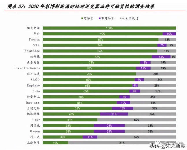 2020年彭博新能源財經通過向可再生能源項目的投資方發(fā)放問卷等形式,對逆變器品牌的可融資性進行了調查。排名較高的品牌意味著更易幫助項目開發(fā)商獲得銀行融資,利于綁定長期客戶群體;另一方面說明該品牌逆變器在產品質量、運行表現(xiàn)、售后服務支持和長期可靠性方面表現(xiàn)突出,利于海外布局的拓展。陽光電源以100%的得票率當選“全球最具融資價值的逆變器品牌”,華為位居第2名,共有9家中國企業(yè)上榜。重要的是,該調查結果展現(xiàn)出國內逆變器企業(yè)在海外擴張業(yè)務的過程中,品牌價值得到提升,逐步得到海外投資方的認可。
