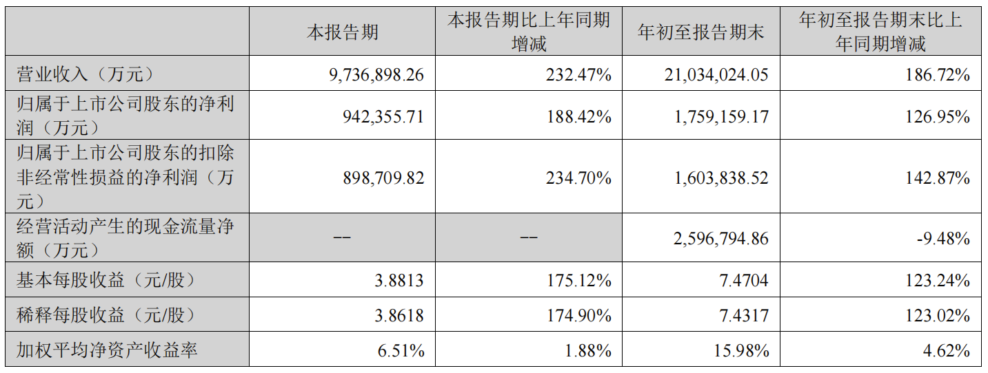 歸屬上市公司股東凈利潤突破94億元,較上年同期增長188.42%,而今年上半年累計81.68億元,創(chuàng)下寧德時代單季度歸母凈利潤歷史新高。