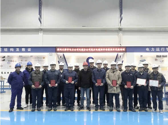 其中,2023年組織國網(wǎng)客戶(包括國網(wǎng)天津市電力公司電纜分公司、國網(wǎng)石家莊供電公司、國網(wǎng)濟南供電公司、國網(wǎng)南昌供電公司、國網(wǎng)保定供電公司、國網(wǎng)鄭州供電公司電纜運檢中心、國網(wǎng)長沙供電公司電纜檢修公司、國網(wǎng)四川省電力公司成都供電公司等)來司開展高壓電纜附件安裝培訓共計9場,參訓學員48人,累計培訓學時584小時;受國網(wǎng)客戶單位邀請開展各類技能比武、安裝技能提升培訓指導服務共計12次,累計培訓、指導課時418小時。2024年2月底到3月初,為國網(wǎng)天津市電力公司電纜分公司的15名青年職工提供為期5天的專業(yè)培訓。