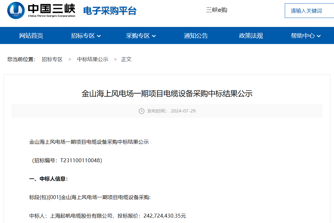 2024年7月29日,中國(guó)三峽電子采購(gòu)平臺(tái)發(fā)布《金山海上風(fēng)電場(chǎng)一期項(xiàng)目電纜設(shè)備采購(gòu)中標(biāo)結(jié)果公示》的公告。