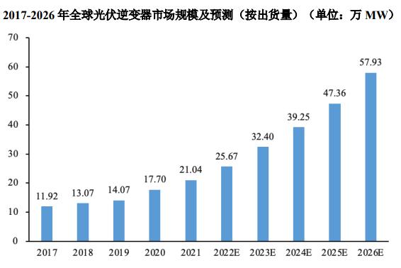 受益于各國對(duì)新能源的推廣,全球光伏新增裝機(jī)容量 GW 級(jí)市場持續(xù)增大,帶動(dòng)光伏逆變器需求快速增加。2017-2021 年,全球光伏逆變器市場規(guī)模逐年增長,期間年復(fù)合增長率為 15.26%,2021 年全球光伏逆變器市場規(guī)模達(dá) 21.04 萬MW,預(yù)計(jì) 2026 年將穩(wěn)定增長至 57.93 萬 MW。
