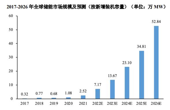 近年,隨著儲(chǔ)能成本的下降、儲(chǔ)能技術(shù)的進(jìn)步,儲(chǔ)能在全球范圍內(nèi)受重視程度不斷提高,裝機(jī)容量逐年提升,據(jù)弗若斯特沙利文數(shù)據(jù),2021 年全球儲(chǔ)能市場規(guī)模達(dá)到 2.52 萬 MW,并預(yù)計(jì)于 2026 年進(jìn)一步增加至 52.84 萬 MW,期間年復(fù)合增長率預(yù)計(jì)達(dá)到 83.8%。