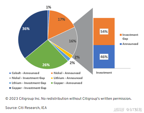 根據(jù)國際能源署(IEA)的數(shù)據(jù),關鍵礦產(chǎn)所需的投資在3600億至4500億美元之間??紤]到已宣布的項目,目前的投資缺口為54%,即1940億美元至2430億美元。目前,投資缺口最大的礦產(chǎn)是銅,占36%,其次是鎳,占16%。