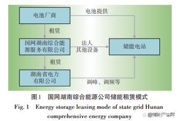 在工商業(yè)用戶市場,美國的AMS公司向用戶提供儲能租賃服務以幫助用戶節(jié)省電費支出。針對新能源消納空間不足以及新能源發(fā)電企業(yè)自配儲能困難的問題,國網湖南綜合能源公司于2020年11月發(fā)布儲能設備租賃招標公告,首創(chuàng)電池租賃模式,該運營模式如圖1所示。