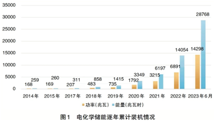 近年來,電化學(xué)儲能呈現(xiàn)爆發(fā)式增長,根據(jù)《統(tǒng)計(jì)數(shù)據(jù)》,2023年上半年,新增投運(yùn)電化學(xué)儲能電站227座、總功率7.41吉瓦、總能量14.71吉瓦時(shí),新增規(guī)模創(chuàng)歷史新高,超過此前歷年累計(jì)裝機(jī)規(guī)??偤?見圖1)。此外,目前在建電化學(xué)儲能電站325座、總功率12.92吉瓦、總能量30.49吉瓦時(shí),按照電化學(xué)儲能電站建設(shè)周期一般6~8個(gè)月計(jì)算,在不計(jì)新增項(xiàng)目的情況下,2023年下半年新增裝機(jī)規(guī)模也將翻一番,提前兩年完成“十四五”規(guī)劃裝機(jī)目標(biāo)(國家發(fā)改委、國家能源局《關(guān)于加快推動(dòng)新型儲能發(fā)展的指導(dǎo)意見》中提到,2025年新型儲能裝機(jī)規(guī)模達(dá)3000萬千瓦以上)。