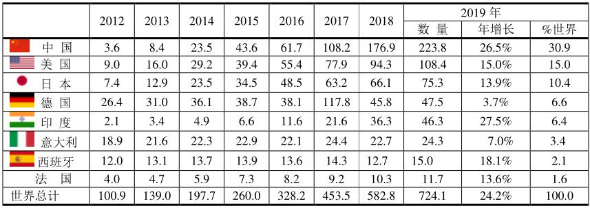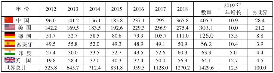 根據(jù)BP 2020的報(bào)告,2019年全球太陽能發(fā)電占全球發(fā)電總量的724.1/27004.7=2.7%,占再生能源發(fā)電總量的724.1/7261.3=10.0%,其份額較少,但進(jìn)展較快。