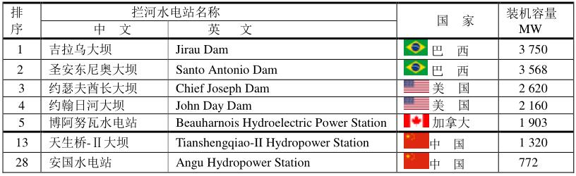 全球徑流式水電站第一位是巴西的“吉拉烏大壩”,美國的“約瑟夫酋長大壩”已經(jīng)從第一位降低到第三位。中國最大的徑流式水電站是天生橋-Ⅱ大壩,世界排序13,裝機(jī)容,1320MW。