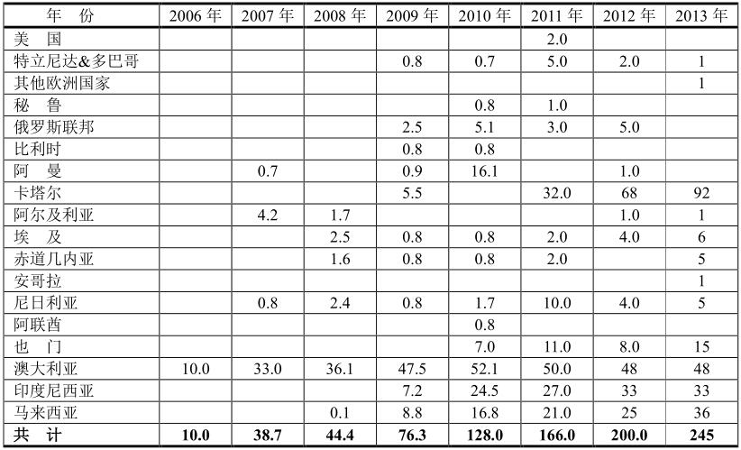 2006~2013年中國LNG進(jìn)口量(億立方米/108m3)