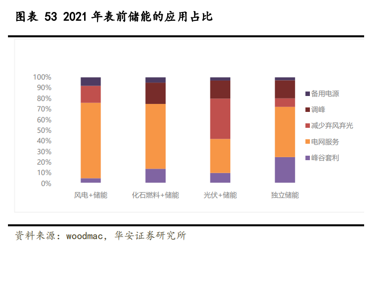 按照是否與新能源電站共址,可將儲(chǔ)能分為獨(dú)立儲(chǔ)能和新能源配儲(chǔ),2020 年之前美 國表前儲(chǔ)能裝機(jī)以獨(dú)立儲(chǔ)能為主,且主要滿足功率型需求,配儲(chǔ)時(shí)長普遍較短,2021 年 起美國表前儲(chǔ)能中新能源配儲(chǔ)的裝機(jī)規(guī)模大幅領(lǐng)先獨(dú)立儲(chǔ)能。隨著越來越多光伏系統(tǒng)接 入電網(wǎng),預(yù)計(jì)能量型需求占比將提升,有望驅(qū)動(dòng)表前儲(chǔ)能平均配儲(chǔ)時(shí)長提高至 4 小時(shí)。 表前儲(chǔ)能的主要作用為電網(wǎng)服務(wù)、峰谷套利、調(diào)峰、減少棄風(fēng)/棄光及備用電源,其 中獨(dú)立儲(chǔ)能主要側(cè)重于電網(wǎng)服務(wù)(50%),光伏配儲(chǔ)更側(cè)重于減少棄光(40%)。