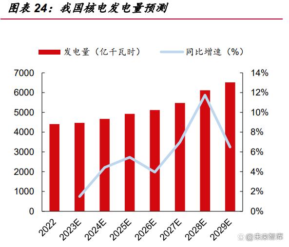 核電逐漸成為我國發(fā)電端的重要一環(huán)。根據(jù)中電聯(lián)預(yù)計,2023 年我國經(jīng)濟運行 有望總體回升,拉動電力消費需求增速比 2022 年有所提高。正常氣候情況下,預(yù)計 2023 年全國全社會用電量 9.15 萬億 kWh,比 2022 年增長 6%左右。預(yù)計 2023 年 底全國發(fā)電裝機容量 28.1 億 kW 左右,其中核電 5846 萬 kW。根據(jù)中國核能行業(yè)協(xié) 會預(yù)計,2035 和 2060 年,核能發(fā)電量在我國電力結(jié)構(gòu)中的占比分別需要達(dá)到 10% 和 20%左右,與當(dāng)前 OECD 國家的平均水平相當(dāng)。 核電裝機維持合理速度增長。我們對現(xiàn)有在運、在建、核準(zhǔn)項目進行測算,由于 2016-2018 年沒有新項目核準(zhǔn),因此 2023-2026 年我國核電裝機增速相對減緩,同 時由于 2019-2022 年恢復(fù)正常核準(zhǔn)且 2022 年核準(zhǔn)達(dá) 10 臺機組,因此核電裝機有望 在 2027-2029 年達(dá)到小高潮,至 2029 年底達(dá) 8365.7 萬 kW,2023-2029 年七年我 國核電裝機 CAGR 達(dá) 6.0%。根據(jù)我國核電建設(shè)進度,以及法國按照電力結(jié)構(gòu) PPE 計劃每年關(guān)閉同等數(shù)量的核電機組,我國在運核電機組數(shù)量預(yù)計在 2024 年超過法國 達(dá)到世界第二位。