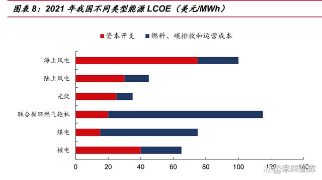 核電項目初期建設(shè)投資高,但綜合考慮運營、燃料、廢物處理費用后的全生命周 期成本后,競爭力凸顯。即使三代核電造價提升,其經(jīng)濟性仍然很強。而且國內(nèi)核電 設(shè)計壽命 40-60 年有余量,到期后一般會申請延壽 20 年,進一步增強了核電的盈利 能力。用平準(zhǔn)化度電成本 LCOE 來評測,根據(jù) IEA 測算,2021 年我國壓水堆核電站 LCOE 約為 65 美元/MWh,僅次于光伏的 35 美元/MWh 和陸風(fēng)的 45 美元/MWh,且 相對煤電具有優(yōu)勢。作為基荷能源,考慮長期運營成本,從成本端對火電、燃?xì)獍l(fā)電 擁有極強替代能力。
