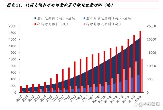 我們根據(jù)目前已公布的在運、在建以及核準(zhǔn)待建核電機組規(guī)模進行估算,2025 當(dāng)年將產(chǎn)生 1330 噸乏燃料,累計乏燃料貯存量達 13099 噸;2030 年當(dāng)年將產(chǎn)生 1883 噸乏燃料,累計 21254 噸,考慮堆內(nèi)貯存池 10 年臨時貯存規(guī)模,2025 年、 2030 年新產(chǎn)生的離堆乏燃料分別為 426 噸、1024 噸;累計需要被處理的離堆乏燃 料分別達到 3121 噸、7095 噸。綜上,2030 年前國內(nèi)需建成具備年處理能力達到千 噸以上規(guī)模的乏燃料后處理廠,目前僅 60 噸/年。