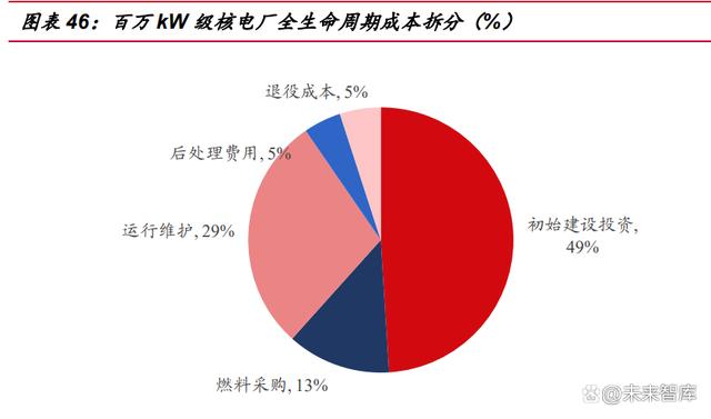 核電在各基荷能源類型中燃料成本占比顯著偏低。核電站具有初始投資高、燃料 費用較低的特點。初始建設(shè)投資一般占電站全生命周期的比例為 45-50%,運營成本 40-45%,其中燃料采購成本(包括鈾礦開采、鈾轉(zhuǎn)化濃縮、燃料組件制造等前段環(huán) 節(jié))僅占 10-15%。經(jīng)合組織核電站的總?cè)剂铣杀就ǔH為燃煤電廠的 1/3~1/2、為 天然氣聯(lián)合循環(huán)電廠 1/4~1/5。此外值得注意的是,核燃料的后處理成本占核電站全 生命周期成本約 5%,隨著我國核電存量裝機規(guī)模的擴大,乏燃料后處理市場潛力不 容小覷。