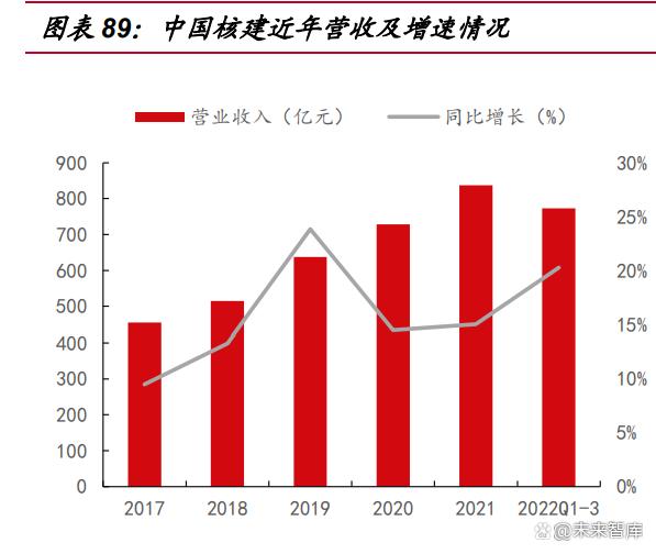 中國核建成立于 2010 年,于 2016 年上市,主營業(yè)務(wù)為核電工程、工業(yè)和民用 工程建設(shè),2018 年中核建設(shè)集團(tuán)與中核集團(tuán)實(shí)行戰(zhàn)略重組推動(dòng)企業(yè)改革。公司正高 水平推進(jìn) “國際熱核聚變實(shí)驗(yàn)堆”項(xiàng)目建設(shè),已成功實(shí)現(xiàn)主機(jī)安裝第一階段任務(wù),國際 品牌影響力顯著提升。公司 2022 年非公開發(fā)行募集資金約 25 億元投入建筑工程項(xiàng) 目,拓寬民用工程業(yè)務(wù)布局。 2022 年公司收入穩(wěn)健增長,2022 年前三季度公司實(shí)現(xiàn)營業(yè)收入 772.8 億元,同 比上升 20.3%,歸母凈利潤 12.8 億元,同比上升 22.8%。根據(jù)公司經(jīng)營情況簡報(bào), 2022 年全年?duì)I業(yè)收入 981.4 億元,同比上升 17.2%,據(jù)此計(jì)算,2022 年第四季度營 業(yè)收入 208.6 億元,同比上升 7.2%。訂單方面,公司 2022 年前三季度累計(jì)新增訂 單 995.2 億元,同比提升 2%,根據(jù) 2022 年 12 月發(fā)布的公開投資者調(diào)研情況公告披 露,2022 年全國共核準(zhǔn) 10 臺(tái)核電機(jī)組,8 臺(tái)已完成招投標(biāo),公司全部參與且全部中 標(biāo),剩余 2 臺(tái)仍在投標(biāo)前期階段,公司有望憑借高資質(zhì)、豐富的建造經(jīng)驗(yàn),持續(xù)中標(biāo) 核島工程訂單。
