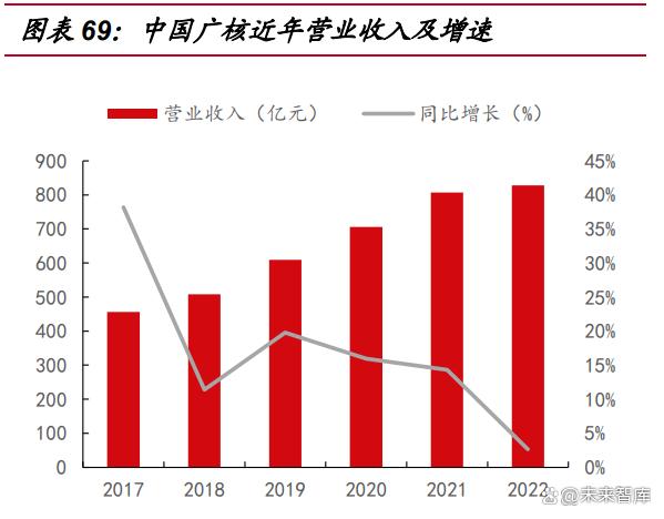 中國廣核是中國廣核集團(tuán)的核電運(yùn)營上市主體,主營業(yè)務(wù)為建設(shè)、運(yùn)營及管理核 電站,銷售核電站所發(fā)電力,組織開發(fā)核電站的設(shè)計(jì)及科研工作。截至 2022 年,公 司管理 26 臺(tái)在運(yùn)和 7 臺(tái)在建核電機(jī)組,裝機(jī)容量分別為 29.38GW 和 8.36GW,在 運(yùn)核電機(jī)組容量占全國在運(yùn)總裝機(jī)容量的 51.91%,是我國最大的純核電運(yùn)營商。 2022 年公司發(fā)電量同比下降,主要原因?yàn)闄z修時(shí)間較 2021 年同期增長,臺(tái)山1、2 號機(jī)組換料大修拖累公司 2022 年的電量表現(xiàn),公司整體 2022 年發(fā)電量下滑 1.38%(包括聯(lián)營企業(yè)),但公司全年?duì)I收及凈利潤等業(yè)績表現(xiàn)依然實(shí)現(xiàn)了小幅增長。 公司 2022 年?duì)I業(yè)收入 828.2 億元,同比增長 2.7%,歸母凈利潤 99.6 億元,同比增 長 2.1%。