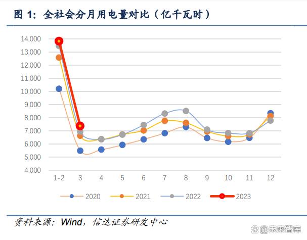 結(jié)構(gòu)方面,2023Q1 第一產(chǎn)業(yè)用電量同比增長(zhǎng) 9.7%,第二產(chǎn)業(yè)用電量同比增長(zhǎng) 4.2%,第三產(chǎn)業(yè)用電量同比增長(zhǎng) 4.1%,而城鄉(xiāng)居民生活用電量同比增長(zhǎng)僅 0.2%(一二三產(chǎn)及居民 生活用電占全社會(huì)用電量的比重分別為 1.25%、65.17%、17.43%、16.15%),居民生活 用電的低增長(zhǎng)拖累一季度整體用電量的增速。從電力消費(fèi)彈性系數(shù)來(lái)看,2022 年度全社會(huì) 用電量增速為 3.6%,GDP 增速為 3%,電力消費(fèi)彈性系數(shù)達(dá)到 1.2;然而受居民生活用電 2023Q1 增速大幅放緩的影響,2023Q1 我國(guó)在實(shí)現(xiàn) 4.5%的 GDP 增速同時(shí),用電量增速僅 3.6%,電力消費(fèi)彈性系數(shù)下降至 0.8。 其中,1-2月一、二、三產(chǎn)業(yè)和城鄉(xiāng)居民生活用電量分別同比變化6.64%、3.48%、-0.11%、 2.75%,而 3 月單月的一、二、三產(chǎn)業(yè)和城鄉(xiāng)居民生活用電量分別同比變化 18.65%、 6.67%、14.04%、-5.76%。3 月以來(lái)開(kāi)工復(fù)蘇潮表現(xiàn)明顯,二產(chǎn)用電增速穩(wěn)中向好,三產(chǎn) 用電增速大幅反彈,但 3 月份居民生活用電同比下降 5.76%,相較于去年同期(2022 年 3 月)高達(dá) 8.92%的居民生活用電增速,降幅高達(dá) 14.68pct。暖冬對(duì)于居民生活用電影響較 大,2 月下旬至 3 月上旬,我國(guó)中東部地區(qū)氣溫明顯升高,相比常年同期偏暖。