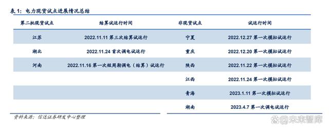 現(xiàn)貨市場(chǎng)分省試運(yùn)行提速,現(xiàn)貨時(shí)代或?qū)?lái)臨。2022 年 11 月,國(guó)家能源局公開(kāi)發(fā)布《電 力現(xiàn)貨市場(chǎng)基本規(guī)則(征求意見(jiàn)稿)》《電力現(xiàn)貨市場(chǎng)監(jiān)管辦法(征求意見(jiàn)稿)》并征求 社會(huì)意見(jiàn),標(biāo)志著全國(guó)范圍內(nèi)的省級(jí)電力現(xiàn)貨市場(chǎng)發(fā)展將出現(xiàn)提速。第一批 8個(gè)試點(diǎn)地區(qū) (南方(以廣東起步)、蒙西、浙江、山西、山東、福建、四川、甘肅)已于 2022 年 6 月 底啟動(dòng)長(zhǎng)周期結(jié)算試運(yùn)行,第二批 6個(gè)試點(diǎn)地區(qū)(上海、江蘇、安徽、遼寧、河南、湖北) 已于 2022 年 7 月底前啟動(dòng)模擬試運(yùn)行。四季度以來(lái),第二批現(xiàn)貨試點(diǎn)中湖北、河南已經(jīng)開(kāi) 始啟動(dòng)調(diào)電試運(yùn)行,江蘇也于 11 月開(kāi)展第三次結(jié)算試運(yùn)行。此外,非現(xiàn)貨試點(diǎn)省份對(duì)于現(xiàn) 貨市場(chǎng)的建設(shè)推進(jìn)積極性也較高:寧夏、重慶、陜西、江西在 2022 年四季度均開(kāi)展首次模 擬試運(yùn)行;青海、湖南也分別于 2023 年 1 月和 4 月開(kāi)展模擬試運(yùn)行和調(diào)電試運(yùn)行。2023 年有望出現(xiàn)全國(guó)范圍內(nèi)的現(xiàn)貨市場(chǎng)熱潮,“現(xiàn)貨時(shí)代”或?qū)?lái)臨。