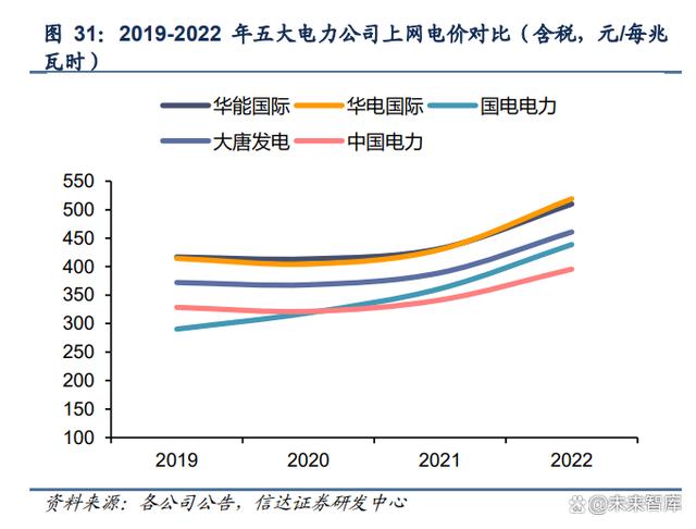 2022 年五大電上網(wǎng)電價(jià)同比上漲明顯,上浮幅度普遍在 18%-20%。2022 年,五大電的煤 電上網(wǎng)電價(jià)普遍實(shí)現(xiàn)上浮,而由于傳統(tǒng)能源裝機(jī)比重較大,2022 年國(guó)電電力和華電國(guó)際綜合上網(wǎng)電價(jià)的上浮最為顯著,其中國(guó)電電力上網(wǎng)電價(jià)達(dá)到 438.88 元/兆瓦時(shí),同比漲幅 21.5%,華電國(guó)際上網(wǎng)電價(jià)達(dá)到 519.25 元/兆瓦時(shí),同比漲幅 20.8%。隨著我國(guó)市場(chǎng)化電價(jià) 機(jī)制的進(jìn)一步完善,電價(jià)上浮空間未來(lái)有望逐步打開。