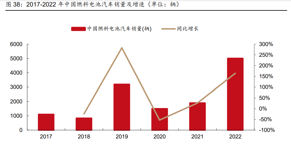 中國(guó)燃料電池汽車(chē)銷(xiāo)量增速明顯,商用車(chē)占據(jù)主導(dǎo)地位。2016-2019 年我國(guó)燃料電池汽 車(chē)銷(xiāo)量持續(xù)增長(zhǎng),2020 年受疫情和補(bǔ)貼政策退坡等因素的影響,燃料電池汽車(chē)銷(xiāo)量出現(xiàn) 下降,而在 2021 年燃料電池汽車(chē)銷(xiāo)量恢復(fù)增長(zhǎng),到 2022 年底,我國(guó)燃料電池汽車(chē)銷(xiāo)量 達(dá)到 5006 輛,同比增長(zhǎng) 164.17%。國(guó)內(nèi)燃料電池汽車(chē)保有量持續(xù)增長(zhǎng),2022 年達(dá)到 12306 輛,同比增長(zhǎng) 37.68%。根據(jù)《中國(guó)氫能產(chǎn)業(yè)發(fā)展報(bào)告 2022》,預(yù)計(jì)至 2025 年,中國(guó)燃料 電池汽車(chē)保有量將發(fā)展到 5-10 萬(wàn)輛,預(yù)計(jì)至 2030 年,燃料電池汽車(chē)將實(shí)現(xiàn)商業(yè)化運(yùn)營(yíng)。 從車(chē)型類(lèi)別來(lái)看,2022 年,我國(guó)燃料電池汽車(chē)銷(xiāo)量中,商用車(chē)占據(jù)主導(dǎo)地位,乘用車(chē)占比 僅為 4.47%。根據(jù)國(guó)際能源署統(tǒng)計(jì)數(shù)據(jù),在國(guó)內(nèi)燃料電池客車(chē)和商用車(chē)政策推動(dòng)下,我國(guó) 在全球燃料電池公交車(chē)和商用車(chē)領(lǐng)域中占據(jù)主導(dǎo)地位。
