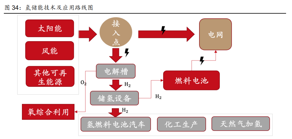 與其他儲(chǔ)能方式相比,氫能更能滿(mǎn)足大規(guī)模、長(zhǎng)時(shí)間消納需求。與抽水儲(chǔ)能、鋰電池儲(chǔ)能 等方式相比,其具有邊際成本低、能量密度大、無(wú)自衰減等優(yōu)勢(shì),能夠?qū)崿F(xiàn)跨周、跨季儲(chǔ) 能。但其實(shí)際應(yīng)用需要經(jīng)過(guò)光伏發(fā)電到制氫再由儲(chǔ)氫發(fā)電的兩次轉(zhuǎn)換,短期內(nèi)儲(chǔ)能效率較 低。鋰電儲(chǔ)能的效率更高,適用于日度調(diào)峰;氫能更針對(duì)于大規(guī)模儲(chǔ)能和季度調(diào)峰,擴(kuò)容 只需要增加儲(chǔ)氫設(shè)備,邊際成本更低。