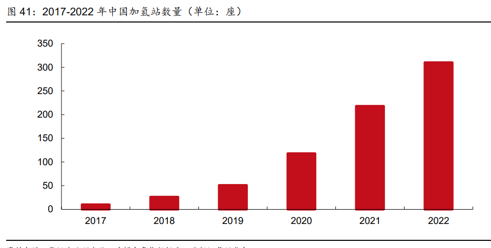 加氫站布局加快,逐漸形成網(wǎng)絡(luò)。加氫站等基礎(chǔ)設(shè)施是否完善是影響消費(fèi)者購(gòu)買(mǎi)氫燃料電 池汽車(chē)熱情的主要因素。隨著國(guó)內(nèi)氫燃料電池汽車(chē)?yán)塾?jì)銷(xiāo)量增加,中石化、中石油等能源 央企不斷加大加氫基礎(chǔ)設(shè)施的投資和建設(shè)力度,國(guó)內(nèi)加氫站數(shù)量呈現(xiàn)快速增長(zhǎng)趨勢(shì)。截至 2022 年底,我國(guó)加氫站累計(jì)建成數(shù)量達(dá)到 274 座。根據(jù) 2020 年中國(guó)汽車(chē)工程學(xué)會(huì)發(fā)布 的《節(jié)能與新能源汽車(chē)技術(shù)路線(xiàn)圖 2.0》相關(guān)規(guī)劃,到 2035 年加氫站的建設(shè)目標(biāo)為至少 5000 座,中國(guó)未來(lái)加氫基礎(chǔ)設(shè)施的市場(chǎng)規(guī)模在 2030-2050 年將突破千億。此外,我國(guó)加 氫站建設(shè)參與主體呈現(xiàn)多樣化趨勢(shì),采取規(guī)?;ㄔO(shè)或加油/加氫/加氣站合建等方式來(lái)拓 展加氫基礎(chǔ)設(shè)施網(wǎng)絡(luò),單位加注成本也有望下降。