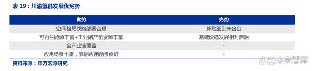 當前,氫能尚處于商業(yè)導入期,氫能產(chǎn)業(yè)的發(fā)展有三個環(huán)節(jié)——上游制儲運、中游燃料電池核心零部件、下游應用端,各重點城市群在氫能建設的道路上尚在突破阻礙,蓄力布局中。川渝地區(qū)在地理位置、氫能資源、產(chǎn)業(yè)鏈體系建設等方面優(yōu)勢巨大,申報此次示范城市群成功可能性極大。川渝地理位置優(yōu)越,空間格局戰(zhàn)略部署合理,形成“一軸、一港、一區(qū)、三路”的“1113”發(fā)展格局。并且,川渝地區(qū)可再生能源豐富,擁有得天獨厚的發(fā)展優(yōu)勢,同時,在成都市,煤化工廠分布密集,副產(chǎn)氫資源頗豐,導致上游制氫成本低。除此之外,川渝氫能產(chǎn)業(yè)制造實力強,現(xiàn)已掌握氫燃料電池、氫源制備、加氫儲氫裝備等領域核心技術,聚集產(chǎn)業(yè)鏈企業(yè)及科研院所200余家,成為了國內氫能產(chǎn)業(yè)鏈基礎較為完整的地區(qū)之一。在應用端,川渝地區(qū)應用氫能應用前景良好,截止到2021年底,成渝地區(qū)實現(xiàn)了440輛的燃料電池汽車的產(chǎn)業(yè)化示范應用,配套建成了15座加氫站。