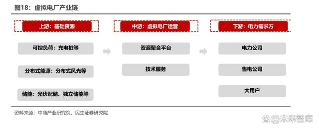 虛擬電廠產(chǎn)業(yè)鏈包括:上游基礎(chǔ)資源、中游虛擬電廠運營、下游電力需求方。 上游基礎(chǔ)資源由可控負(fù)荷、分布式能源與儲能構(gòu)成;中游是提供運營服務(wù)與技術(shù)支 持的虛擬電廠運營平臺;下游則由電力公司、售電公司、工業(yè)企業(yè)、商業(yè)用戶等電 力需求方構(gòu)成。