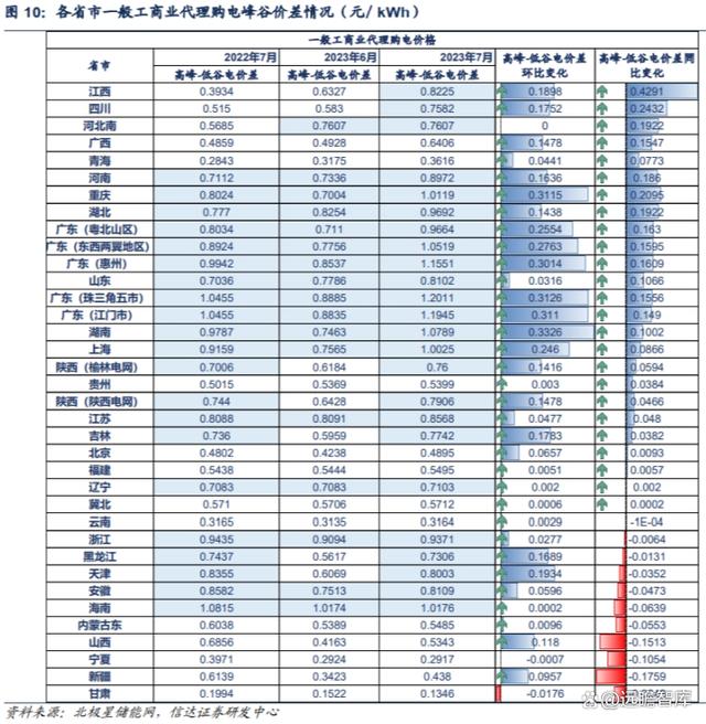全國峰谷價(jià)差大于 0.7 元/kWh 的省份已達(dá) 19 個(gè),且價(jià)差呈擴(kuò)大趨勢。0.7 元/kWh 為工商業(yè)儲(chǔ)能具備經(jīng)濟(jì)性的峰谷價(jià)差門檻值。數(shù)量變化上,2022 年 7 月至 2023 年 7 月,我國峰谷價(jià)差超過 0.7 元/kWh 的省份從 16 個(gè)增加至 19 個(gè)。價(jià)差變化上,共有 20 個(gè)地區(qū)的峰谷價(jià)差增大,如江西省從0.3934/kWh 提升至 0.8225/kWh,山東省從 0.7036/kWh 提升至 0.8102/kWh。各地峰谷價(jià)差普遍拉 大,意味著配置工商業(yè)儲(chǔ)能的套利空間擴(kuò)大。