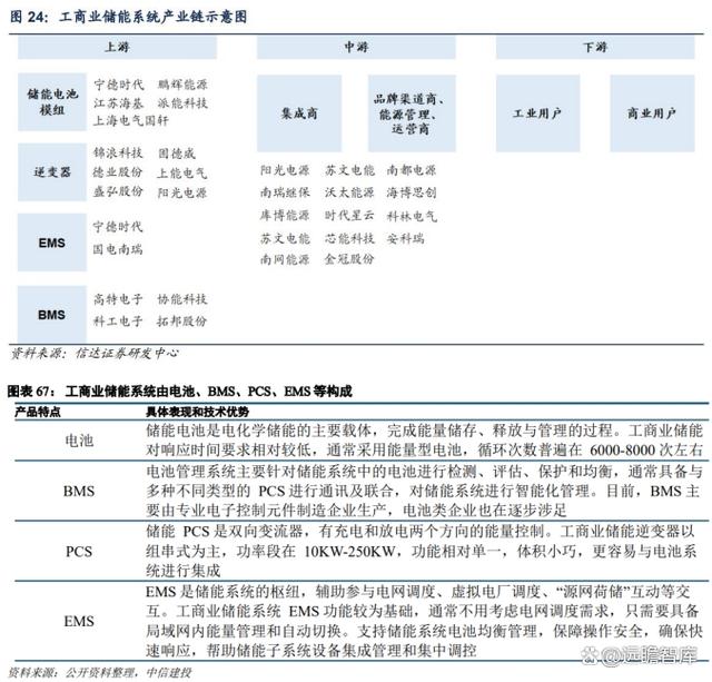 工商業(yè)儲能系統(tǒng)產(chǎn)業(yè)鏈完善,與大儲、戶儲同源。上游是各類設(shè)備,中游是系統(tǒng)集成商和開發(fā)運營商,下游是工商業(yè)運營商。上游部件環(huán)節(jié)中,儲能電池模組由電芯經(jīng)過串并聯(lián)組成用以儲存電力;逆變器進行交流電與直流電的轉(zhuǎn)換,根據(jù)功率指令對電池進行充放電;BMS 是控制、管理電池各項功能并保護電池的核心部件,亦具備和 EMS、SCADA(能量管理系統(tǒng)及監(jiān)控系統(tǒng))通訊功能,目前也有部分電池廠家開始自主設(shè)計 BMS;EMS 控制逆變器并采集逆變器數(shù)據(jù)、控制電池模組并采集電芯數(shù)據(jù)、執(zhí)行邏輯(各種應(yīng)用)并與其他設(shè)備集成調(diào)度。中游集成商與品牌渠道商直接與下游工商業(yè)用戶對接,需要對BMS/EMS 系統(tǒng)及儲能應(yīng)用場景有著高理解,且 BMS/EMS 系統(tǒng)基本為自研,以完成對上游設(shè)備的高效整合。
