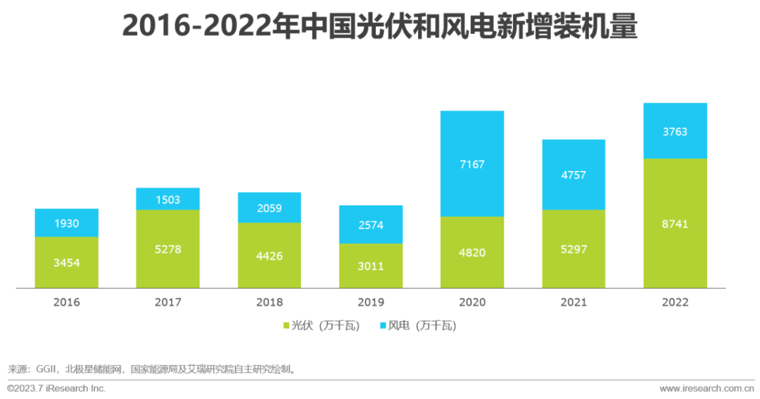 新型發(fā)電形式在電力市場裝機量中占比不斷增加,2022年我國風電、光伏發(fā)電量達到1.19萬億千瓦時,較2021年增加2073億千瓦時,同比增長21%,占全社會用電量的13.8%,同比提高2個百分點,接近全國城鄉(xiāng)居民生活用電量。同時電力基礎設備的老舊化已無法適應新型電力系統(tǒng)更綜合且龐大的電力結構。在風光發(fā)電模式的逐漸成熟化下,為提升整體電力系統(tǒng)可靠性,協(xié)調資源靈活使用、穩(wěn)定消納,市場開始逐步催生配儲需求。