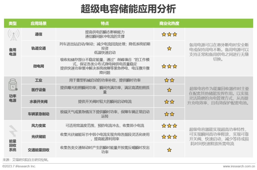 超級電容的電學特性決定了其直接做功的瞬時補償特征突出,并且功率損耗較低。在一些極端理想場景下,對于基于安全性考慮的響應效率和基于功率要求的超高功率特征,決定了其在重要的工業(yè)、基礎設施(通信、軌道交通等)均具備很理想的適用性。同時,如果能匹配其他的儲能方式,實現(xiàn)高功低釋的電能轉化,其場景應用將會更加靈活廣泛。