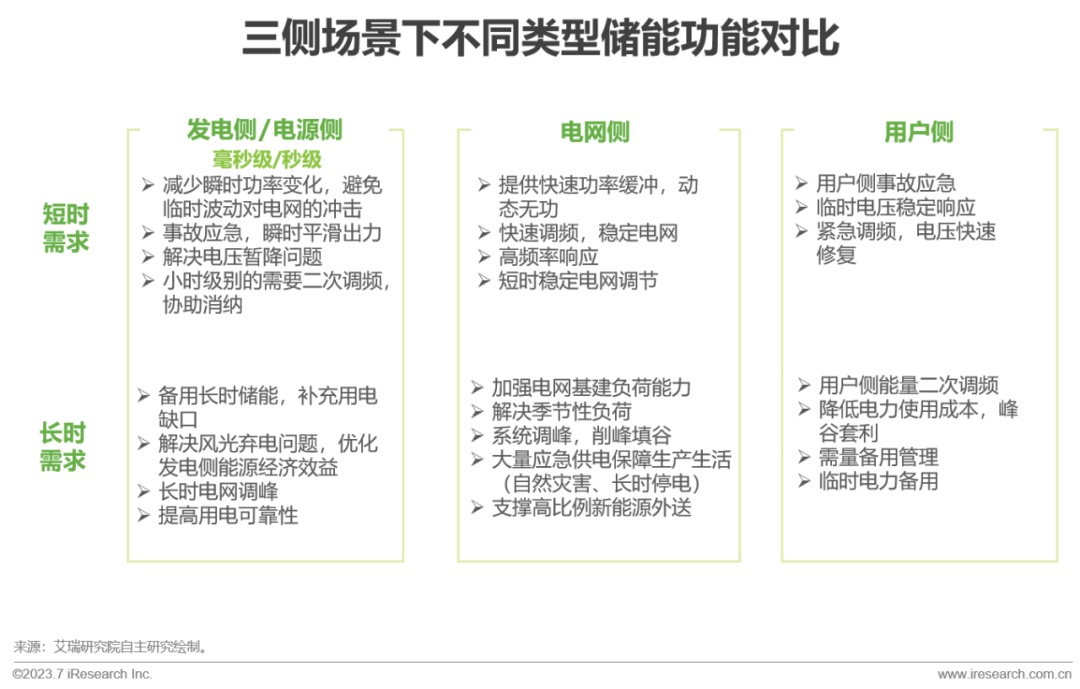 從電網角度來看,發(fā)電側、電網側和用戶側在不同時間維度下都存在不同痛點,以對應不同配儲的需求,從而實現(xiàn)電力系統(tǒng)長效、高經濟型發(fā)展。