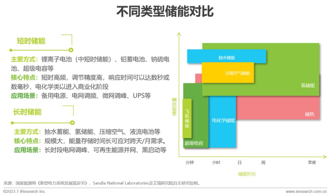 儲能形式目前已呈現(xiàn)多元化局面,根據(jù)技術路徑不同主要分為熱儲能、電儲能和氫儲能三大類,其中電儲能又可分為物理儲能、電磁儲能和電化學儲能。技術性質的不同影響了產品的響應和放電時間。根據(jù)使用場景和需求不同,我們按照響應速度和放電時間將儲能方式分為長時和短時儲能兩大類。面對新能源有集中式和分布式各類場景,儲能與其結合應用也將對應不同方式應用。