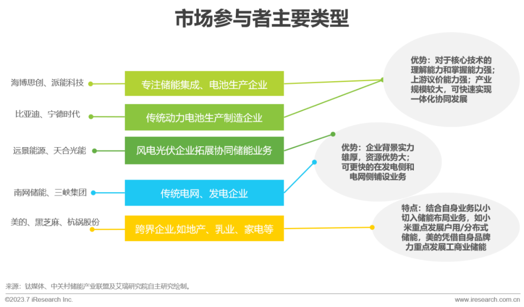 新能源的火熱帶動了儲能產業(yè)的快速發(fā)展,盡管儲能仍處于產業(yè)發(fā)展初期階段,商業(yè)模式和市場格局仍未定局。但市場已涌現(xiàn)各式參與者瓜分“蛋糕”。從動力電池廠商到食品互聯(lián)網企業(yè)跨界參與,市場玩家不斷涌入。市場參與者各有優(yōu)勢。針對儲能行業(yè)發(fā)展正處于供需端適配過程。