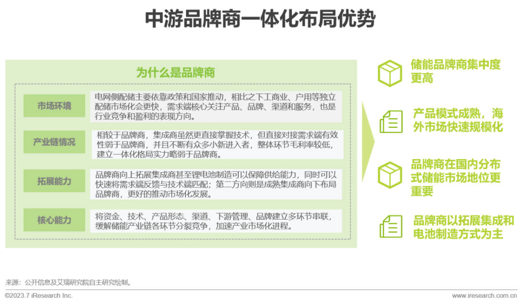 行業(yè)的發(fā)展終究要以市場為主,玩家把握市場端的打法也是產業(yè)逐漸成熟化的標志。品牌商作為鏈接制造端和市場端的核心環(huán)節(jié),直接將上端集成產品通過設計開發(fā)及管理對標售賣給下游B、C端客戶,然后搭配一系列的供應渠道、售后服務等實現(xiàn)商業(yè)化發(fā)展。未來的資本認可度會逐步增高。以品牌商為核心想向產業(yè)鏈上下游布局會成為行業(yè)集中化發(fā)展的主要形態(tài)。