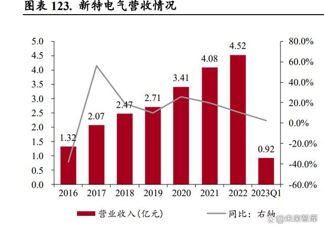 公司營(yíng)業(yè)收入快速增長(zhǎng),干式變壓器貢獻(xiàn)主要收入。公司客戶包括新能源、高端裝備、高效節(jié)能、 工業(yè)企業(yè)電氣配套、基礎(chǔ)設(shè)施、民用住宅、傳統(tǒng)發(fā)電與供電、新型基礎(chǔ)設(shè)施等領(lǐng)域,其中新能源的 營(yíng)收占比最高,是公司主要收入來(lái)源。受益于新能源領(lǐng)域的良好發(fā)展,公司營(yíng)業(yè)收入從 2017 年的 20.11 億元增加到 2022 年的 47.46 億元,CAGR 達(dá) 18.73%,2023 年一季度實(shí)現(xiàn)營(yíng)業(yè)收入 12.97 億元, 同比增長(zhǎng) 41.06%,繼續(xù)保持增長(zhǎng)態(tài)勢(shì)。分產(chǎn)品看,2017-2022 年干式變壓器系列收入占比 70%左右, 為公司主要的營(yíng)收來(lái)源,儲(chǔ)能業(yè)務(wù)和數(shù)字化整體解決方案業(yè)務(wù)起步,給公司帶來(lái)新的收入增長(zhǎng)點(diǎn)。