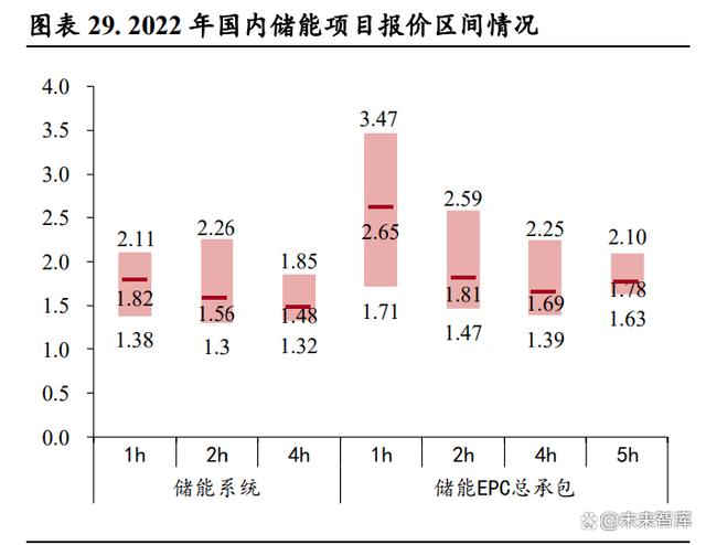 儲(chǔ)能系統(tǒng)投標(biāo)價(jià)格持續(xù)下行,刺激需求釋放。根據(jù)儲(chǔ)能與電力市場(chǎng)公眾號(hào)的統(tǒng)計(jì),2022 年招標(biāo)的近 150個(gè)儲(chǔ)能項(xiàng)目中,2h 的儲(chǔ)能系統(tǒng)占比達(dá) 63%,平均報(bào)價(jià) 1.56 元/Wh;儲(chǔ)能 EPC 總承包招標(biāo)的近 120 個(gè)項(xiàng)目中,2h 的 EPC 項(xiàng)目占比達(dá) 77%,平均報(bào)價(jià) 1.81 元/Wh。從時(shí)間維度上來(lái)看,2022 年儲(chǔ)能系 統(tǒng)報(bào)價(jià)呈現(xiàn)出了“兩頭高中間低”的特點(diǎn),并且從 5 月起持續(xù)穩(wěn)定在 1.5-1.6 元/kWh 的范圍之內(nèi), 而進(jìn)入 2023 年之后,隨著電芯主要原材料碳酸鋰價(jià)格的進(jìn)入下行通道,儲(chǔ)能系統(tǒng)報(bào)價(jià)屢創(chuàng)新低,2023 年 7 月份 2 小時(shí)儲(chǔ)能系統(tǒng)的平均報(bào)價(jià)為 1.12 元/Wh,同比下降 28.24%,環(huán)比下降 0.88%,最低報(bào)價(jià) 低至 1.00 元/Wh,而 4 小時(shí)儲(chǔ)能系統(tǒng)最低報(bào)價(jià)低至 0.87 元/Wh。儲(chǔ)能系統(tǒng)價(jià)格的快速下降,將有力 提升大儲(chǔ)項(xiàng)目業(yè)主方的投資積極性,推動(dòng)項(xiàng)目的建設(shè)進(jìn)程。